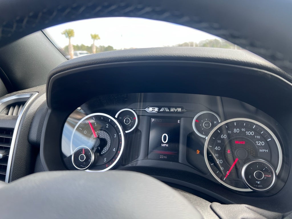 Quick Order Package 24Z Big Horn. Night Edition: Firestone Brand Tires; Gloss Black Nostrils/mic Black Grille; LT285/60R20E OWL On/off Road Tires; Black Exterior Truck Badging; 20" X 8.0" Black Painted Aluminum Wheels; Body Color Grille-Surround; Black Interior Accents; Black Wheel Center Hub; Painted Front Bumper; Painted Rear Bumper. Big Horn Level 1 Plus Equipment Group: Google Android Auto; SiriusXM Radio Service; For Details. Visit DriveUconnect.com; For More Info. Call 800-643-2112; Integrated Voice Command with Bluetooth®; Emergency Vehicle Alert System (EVAS); 12" Touchscreen Display; Glove Box Lamp; Auto Power-Folding Mirrors; Footwell Courtesy Lamp; Anti-Spin Differential Rear Axle; Mirror Running Lights; MOPAR Deployable Bed Step; Alexa Built-In; Apple CarPlay; Power-Adjustable Convex Aux Mirrors; Forward and Reverse Utility Lights; Locking Lower Glove Box; Remote Start System; 9 Alpine Speakers with Subwoofer; Disassociated Touchscreen Display; Dual Glove Boxes; 2nd Row in Floor Storage Bins; Rear View Auto Dim Mirror; Rear Dome with On/off Switch Lamp; LED Bed Lighting; Connectivity - US/Canada; GPS Navigation; 4G LTE Wi-Fi Hot Spot; GPS Antenna Input; Exterior Mirrors with Heating Element; SiriusXM with 360L; Global Telematics Box Module; Connected Travel and Traffic Services; Foam Bottle Insert (door Trim Panel); Black Exterior Mirrors; Big Horn Instrument Panel Badge; Off-Road Info Pages; Selectable Tire Fill Alert; Trailer Tow Pages; HD Radio; Uconnect 5 Navigation with 12.0" Display Radio; Power Heated Folding Telescopic Mirrors; Exterior Mirrors with Supplemental Signals; Steering Wheel Mounted Audio Controls; Exterior Mirrors Courtesy Lamps; Air Conditioning ATC with Dual Zone Control; MOPAR Spray in Bedliner; Power Adjust Mirrors; Luxury Steering Wheel; Power Telescoping Mirrors. Heated Seats and Wheel Group: Heated Front Seats; Heated Steering Wheel. Quick Order Package 2UZ Big Horn. 5th Wheel/gooseneck Towing Prep Group. Anti-Spin Differential Rear Axle. MyFlexCare Service Diesel. Premium Cloth Bucket Seats. Remote Start System. Power 2-Way Driver Lumbar Adjust. Transfer Case Skid Plate Shield. **Equipment listed is based on original vehicle build and subject to change. Please confirm the accuracy of the included equipment by calling the dealer prior to purchase.**