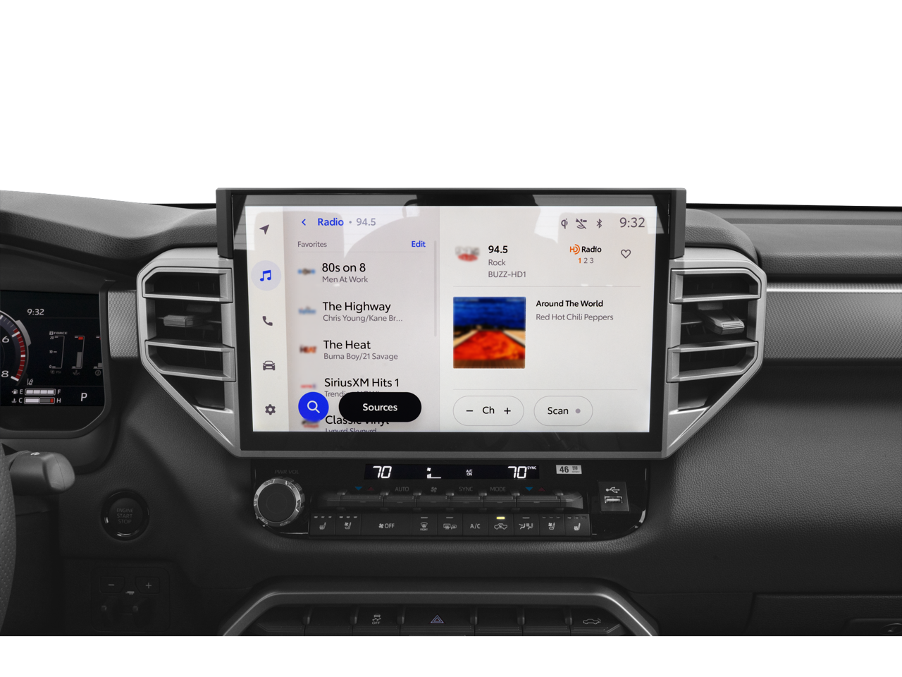 - Radio: Audio Plus -inc: 14-inch touchscreen, 9 speakers, Android Auto and Apple CarPlay compatible and SiriusXM w/3-month platinum plan trial subscription, See toyota.com/audio-multimedia for details